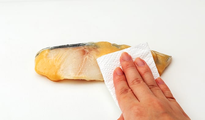 - 冷蔵庫で半日解凍後、味噌、粕等を軽く拭き取ってください。