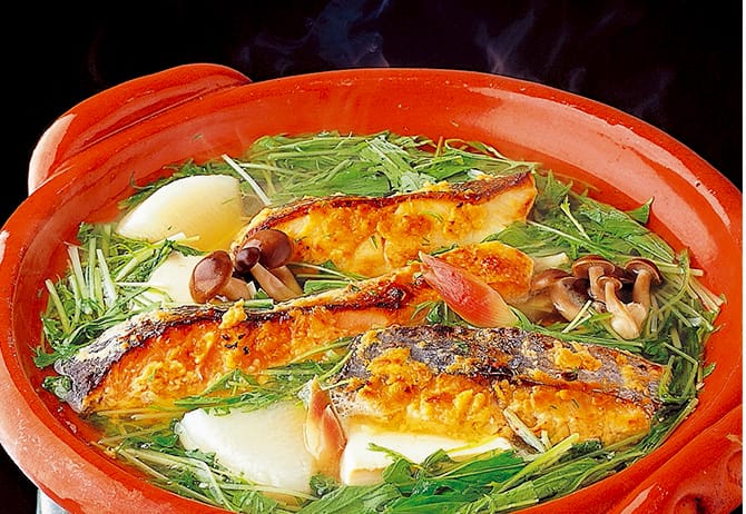 - 三、 二が沸騰したら水菜やその他の材料を入れ、焼き上げた魚を上にのせる。