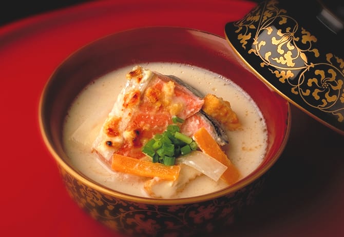 - 二、 かす汁に好みの具を入れ、最後に魚を入れ火が通ったら完成。