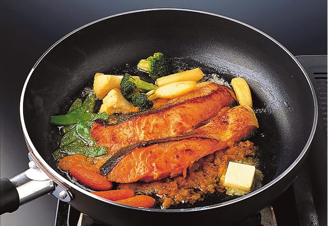 - 二、 フライパンに油をひき、熱くなったら魚を入れる。